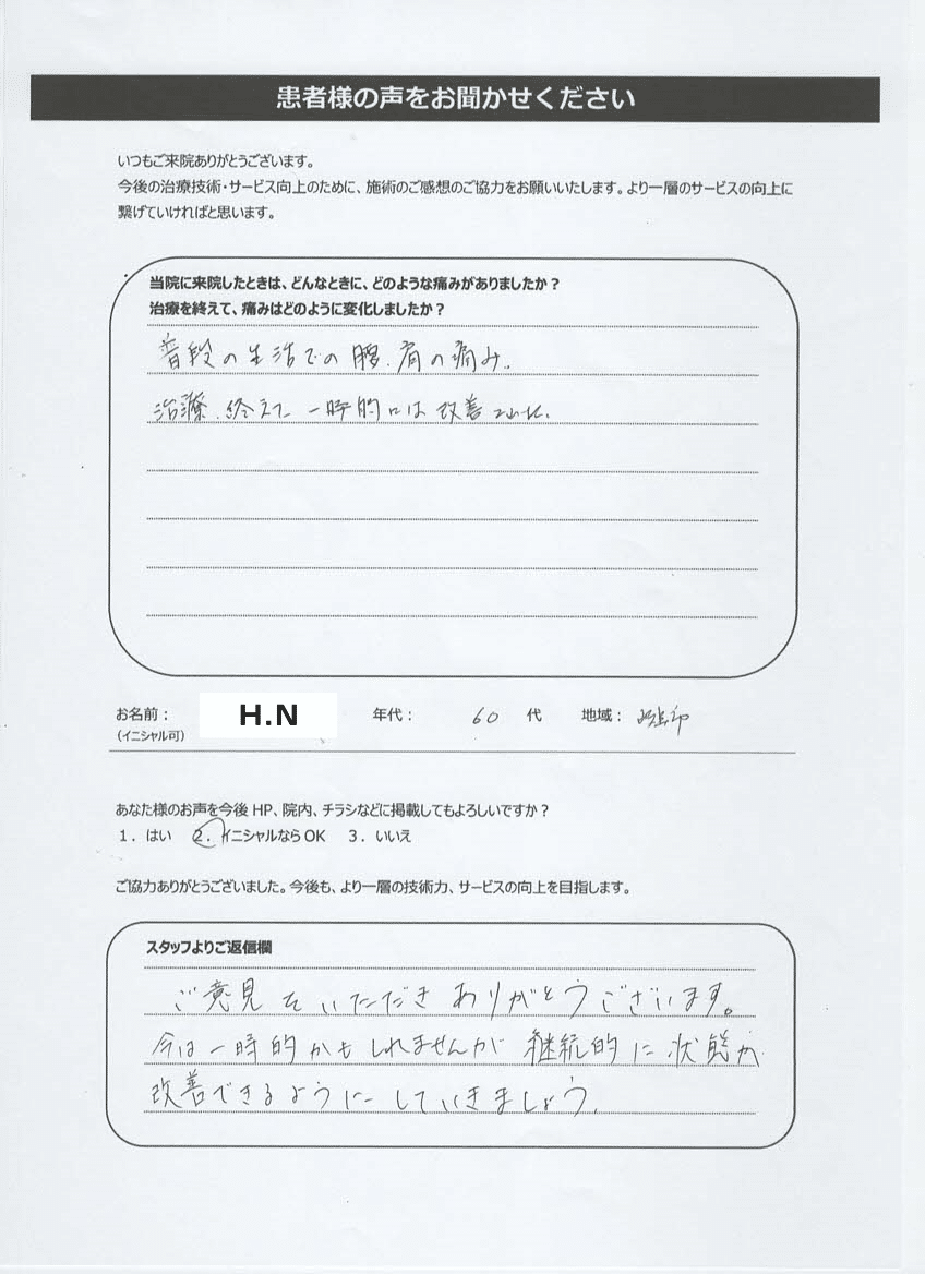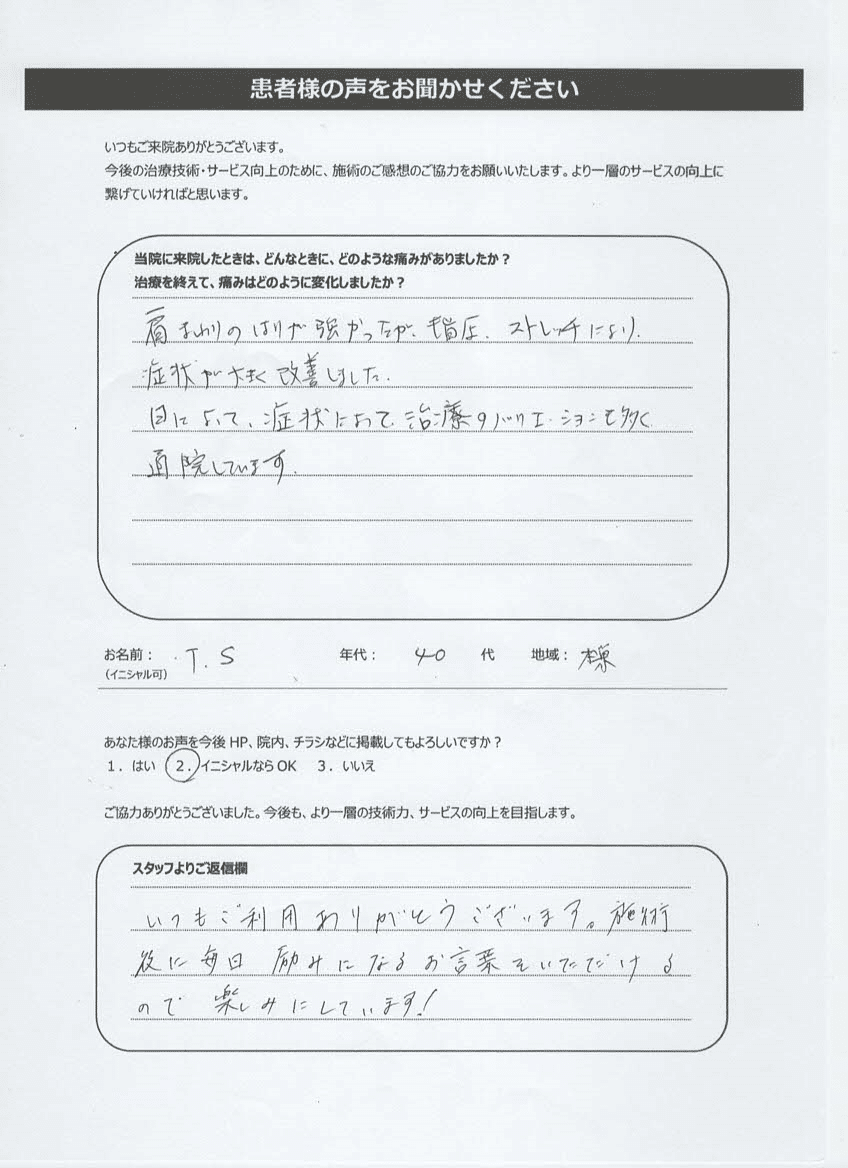 励みになるお声を頂きありがとうございます。肩・首の症状がより一層改善できるように今後も取り組んでいきます。