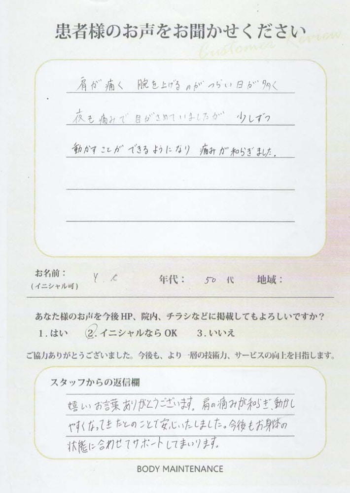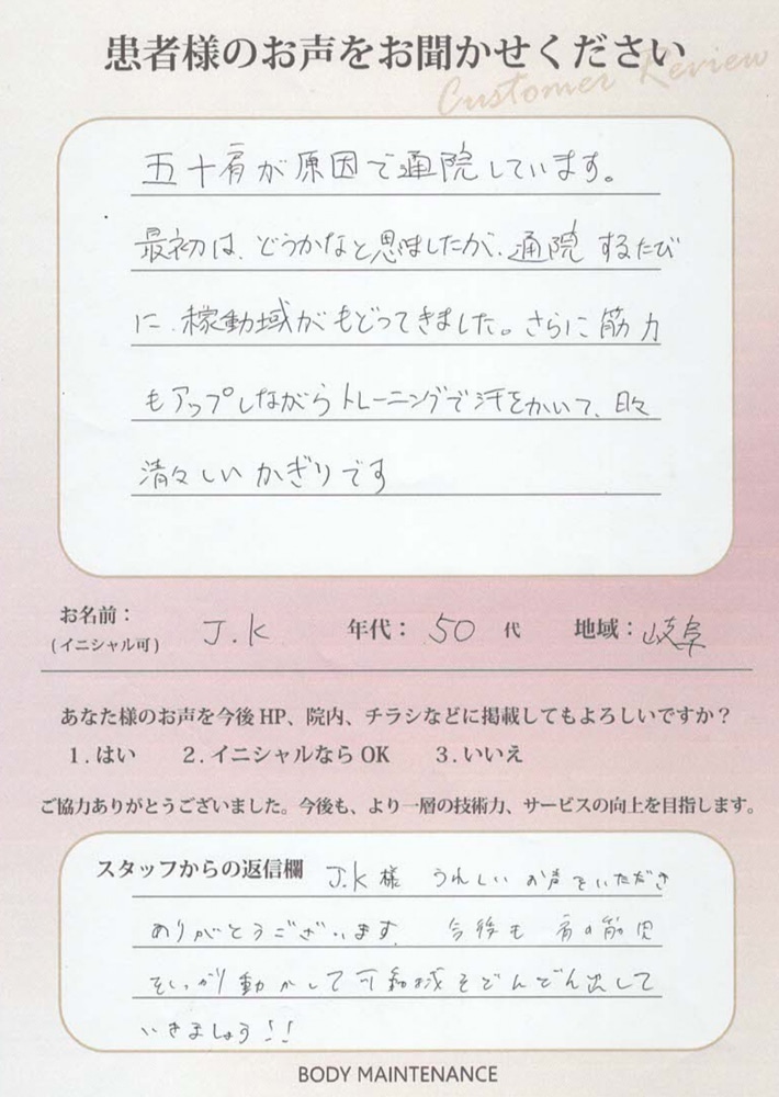 J.K様、うれしいお声をいただきありがとうございます。今後も肩の筋肉をしっかり動かして可動域をどんどん出していきましょう!