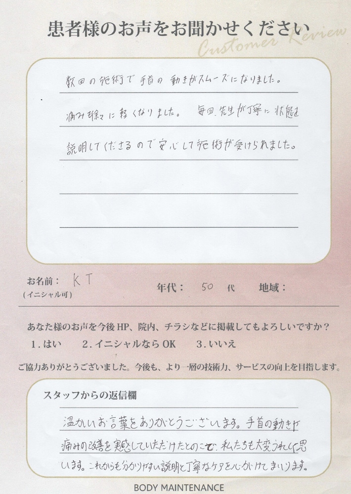 温かいお言葉ありがとうございます。手首の動きや痛みの改善を実感していただけたとのことで、私達も大変うれしく思います。これからも分かりやすい説明と丁寧なケアを心がけてまいります。